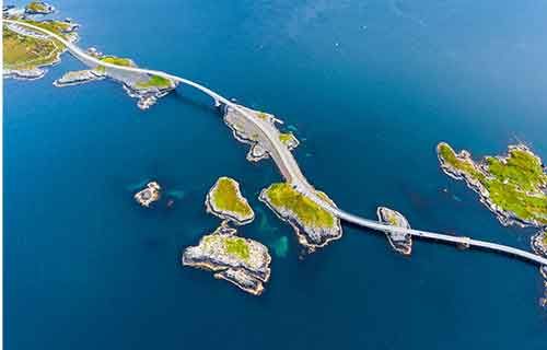 Percorrerla in moto significa vivere un itinerario unico, in equilibrio sul mare. Gli 8,3 km della Atlantic Road serpeggiano tra onde impetuose e panorami aperti sull’oceano. Il più iconico è il ponte Storseisundet, famoso per la sua forma arcuata che – da certe angolazioni – sembra finire nel nulla. In moto, la curva del ponte regala una sensazione di volo sopra le acque.